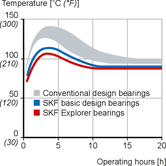 Tapered roller bearings typically have a running-in period, during which a conventional design tapered roller bearing experiences a significant amount of friction, resulting in wear. This effect is noticed as a temperature spike (diagram 1). With SKF tapered roller bearing designs, friction, frictional heat and wear are significantly reduced, provided the bearings are mounted and lubricated correctly. - Separable and interchangeable