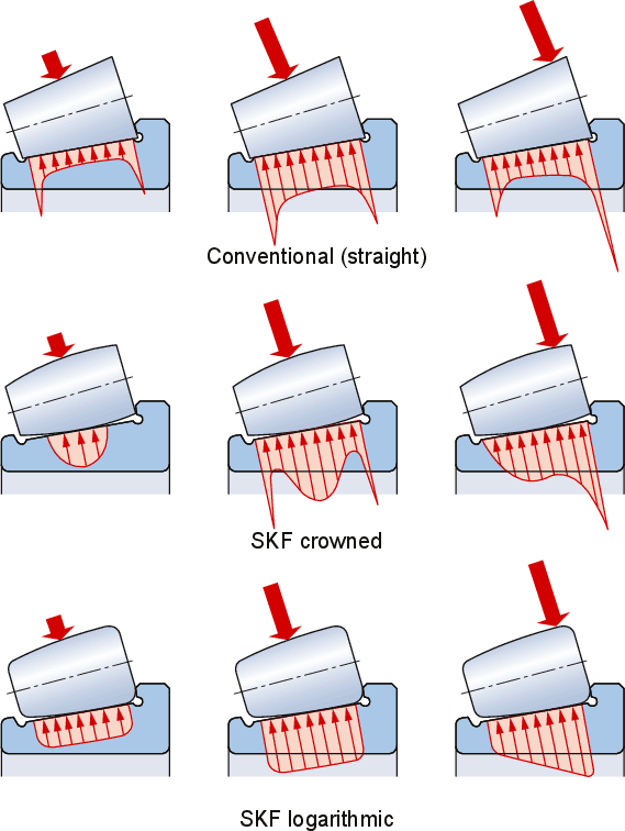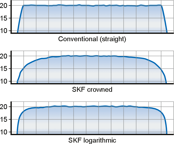 The crowned raceway profiles of basic design bearings and the logarithmic raceway profiles of SKF Explorer bearings optimize the load distribution along the contact surfaces, reduce stress peaks at the roller ends (fig. 4), and reduce the sensitivity to misalignment and shaft deflection compared with conventional straight raceway profiles (fig. 5). - Enhanced operational reliability