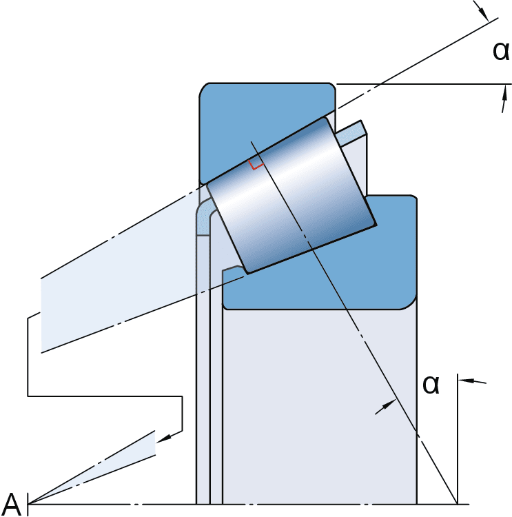 SKF single row tapered roller bearings (fig. 1) are designed to accommodate combined loads, i.e. simultaneously acting radial and axial loads. The projection lines of the raceways meet at a common point on the bearing axis (apex point A, fig. 2) to provide a true rolling action and therefore low frictional moments during operation. The axial load carrying capacity of tapered roller bearings increases with increasing contact angle α. The size of the contact angle, which is usually between 10° and 30°, is related to the calculation factor e (→ product table): the larger the value of e, the larger the contact angle.SKF single row tapered roller bearings are available in many designs and variants (→ Designs and variants) and in many series and sizes, including:- basic design bearings